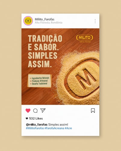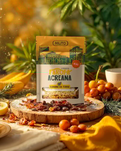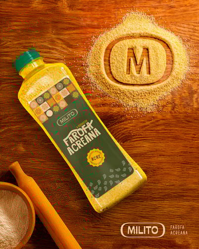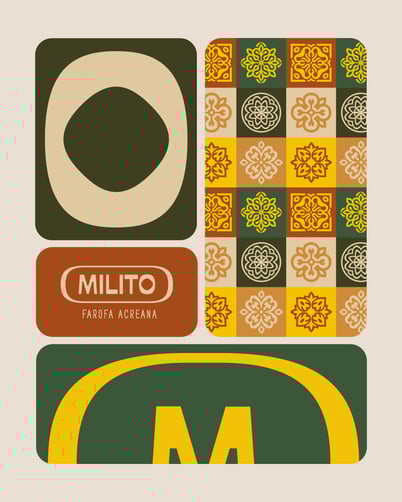Para a identidade visual da MILITO Farofa Acreana, buscamos capturar a alma do Acre e a riqueza de seus sabores. Desde a tipografia até os grafismos, cada detalhe foi pensado para transmitir a tradição e o orgulho dessa culinária única. Com formas rústicas e autênticas, remete ao artesanato e à cultura popular, trazendo um toque de tradição e identidade ao projeto. Cada embalagem conta uma história, valorizando o sabor, a cultura e a tradição acreana. MILITO não é só farofa, é uma experiência de sabor e pertencimento!